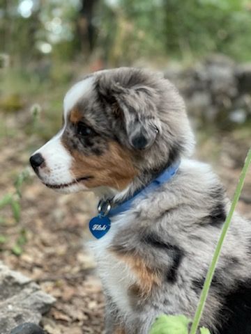 | Couleur | Bleu merle porteur rouge |